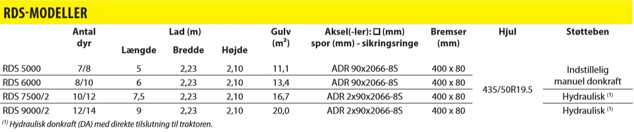 BETIMAX RDS er forsynet med et ”hældningssystem”. Akslen/akslerne er monteret på dobbeltvirkende hydraulikcylindere, der giver mulighed for at sætte vognens bagende på jorden. Højden for på- og afl æsning er derfor begrænset til 14 cm, mens transporthøjden er 63 cm. Dette hældningssystem erstatter adgangsrampen, så der kræves ingen handling fra brugerens side, og risikoen for uheld begrænses ved på- og afl æsning af kvæget. Hver cylinder er forsynet med en sikkerhedsanordning, der forhindrer køretøjet i at falde ned, hvis de hydrauliske slanger skulle briste.
