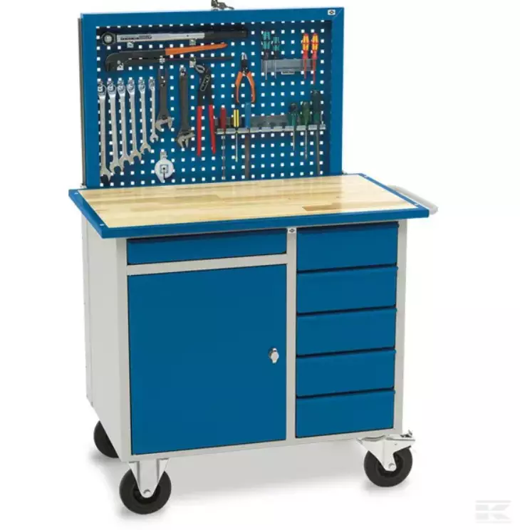 - Værkstedsvogn type VV-2 med bøgeparket bordplade med stålramme og hjul (2 faste og 2 drejelige med bremse).