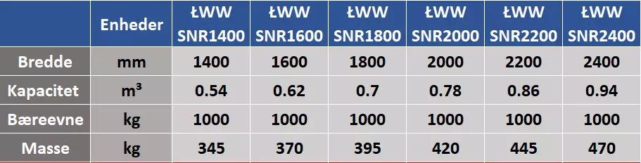 | Enheder | ŁWW SNR1400 | ŁWW SNR1600 | ŁWW SNR1800 | ŁWW SNR2000 | ŁWW SNR2200 | ŁWW SNR2400 | |