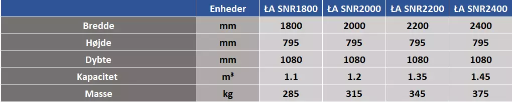 | Enheder | ŁA SNR1800 | ŁA SNR2000 | ŁA SNR2200 | ŁA SNR2400 | |